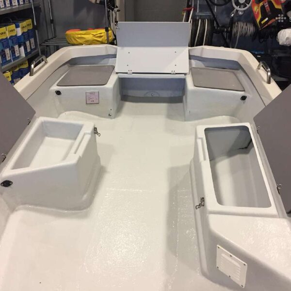 The boat is designed for practical everyday fishing: a wide deck, three large storage compartments, stainless steel rails, side protection strip, drainage system and space for a fuel tank.